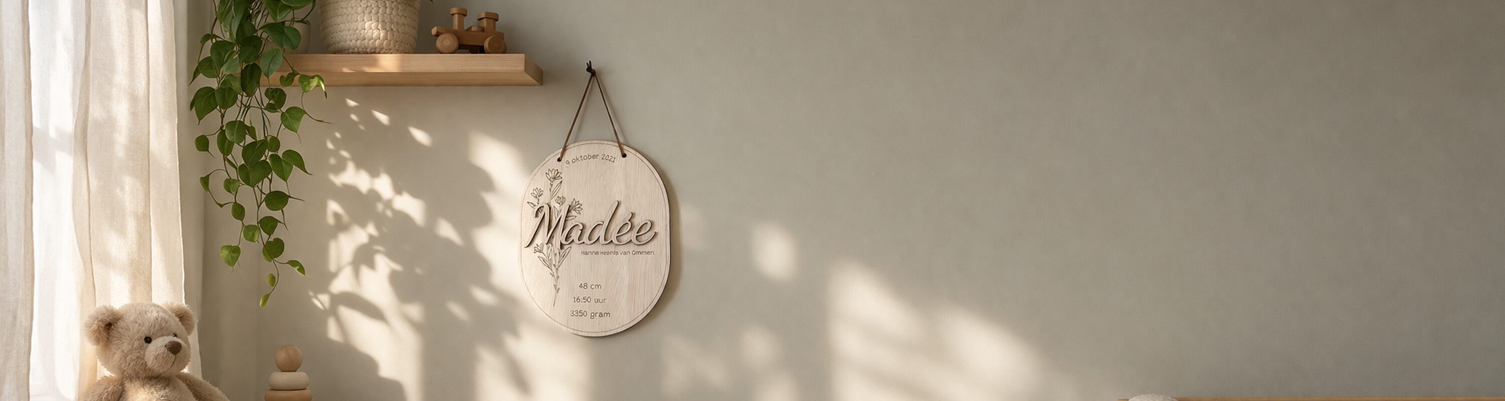 De geboorte van je kindje is een moment dat je voor altijd wilt koesteren, en een houten geboortebord is de perfecte manier om dit te vieren. Deze stijlvolle en duurzame decoratie wordt met zorg gemaakt en kan helemaal worden gepersonaliseerd met de naam van je baby, de geboortedatum en geboortegegevens. Hang het geboortebord aan de deur om je kleintje feestelijk te verwelkomen, geef het een prominente plek in de babykamer, of gebruik het als een blijvende herinnering aan die eerste, onvergetelijke momenten. Dankzij de natuurlijke uitstraling en het hoogwaardige hout is het bord een prachtig en uniek item dat jarenlang meegaat.