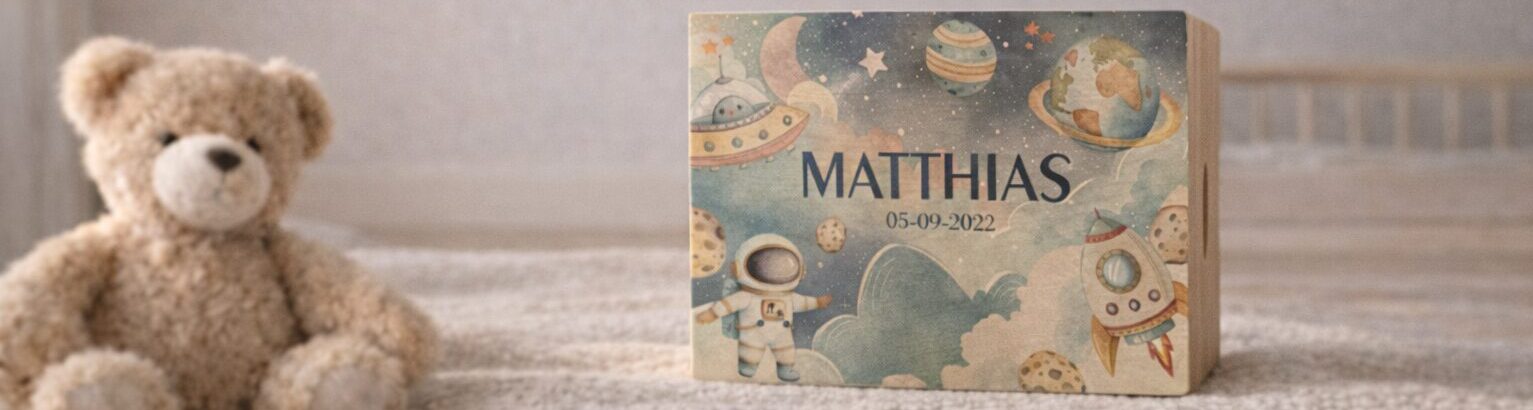 Op zoek naar een unieke manier om de mooiste momenten van je kindje te bewaren? Onze memorybox is de perfecte oplossing! Deze houten kist is ideaal voor het opbergen van speelgoed, kunstwerken, foto’s of andere kostbare herinneringen. Je kunt de box gepersonaliseerd laten graveren met de naam van je kindje, zodat het een speciaal en persoonlijk item wordt dat een leven lang meegaat. Of je maakt de keuze uit een kleurenprint met diverse thema’s.