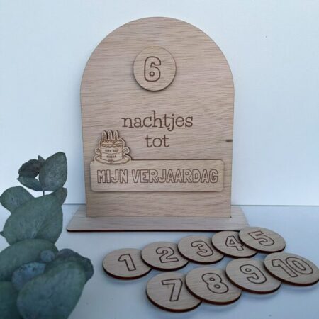 De houten aftelkalender maakt elk bijzonder moment extra speciaal. Het dagelijks omdraaien van een cijfer wordt een klein ritueel waar kinderen naar uitkijken. Of het nu nog 10 nachtjes slapen is tot Sinterklaas, of aftellen naar de zomervakantie — met deze kalender wordt elk moment een belevenis.