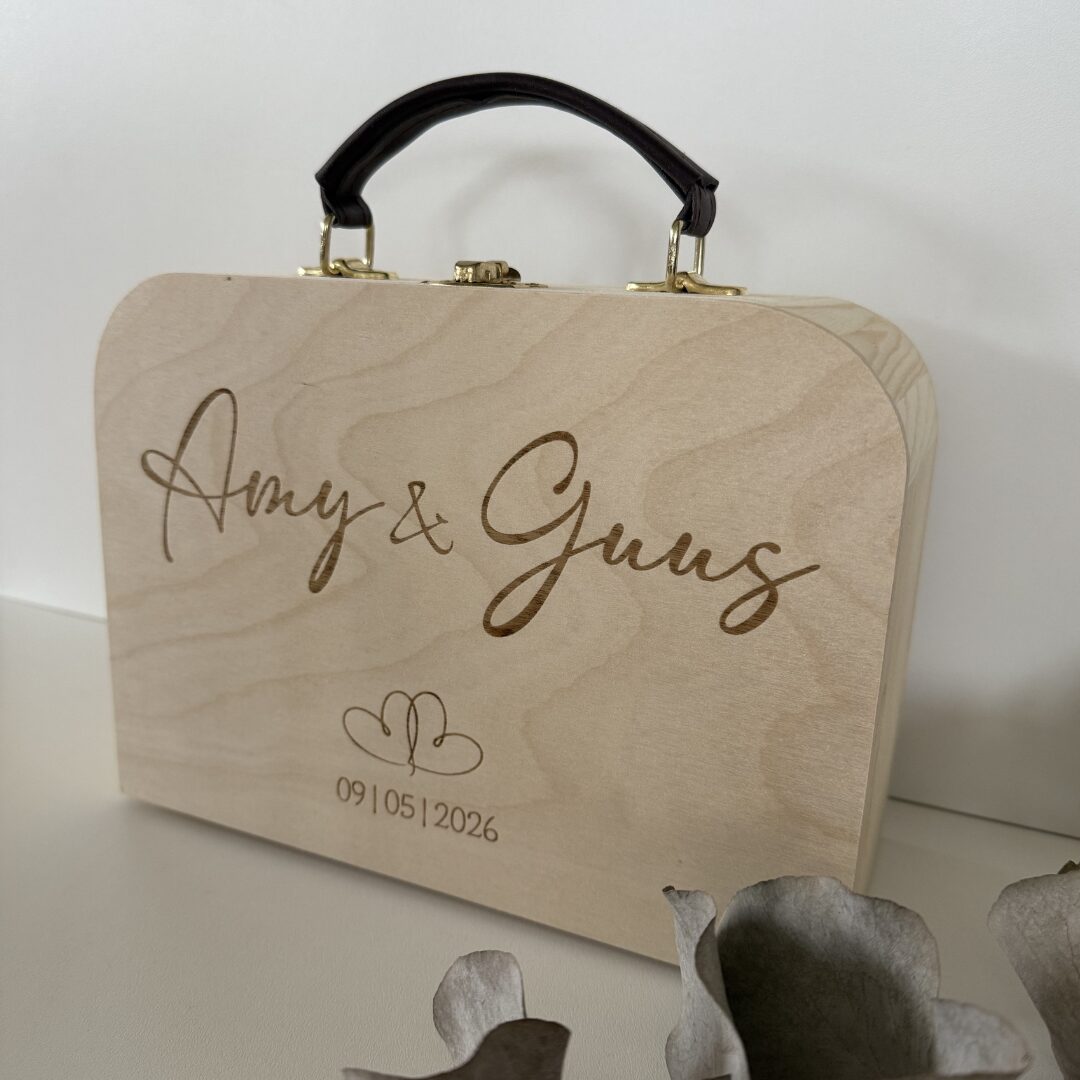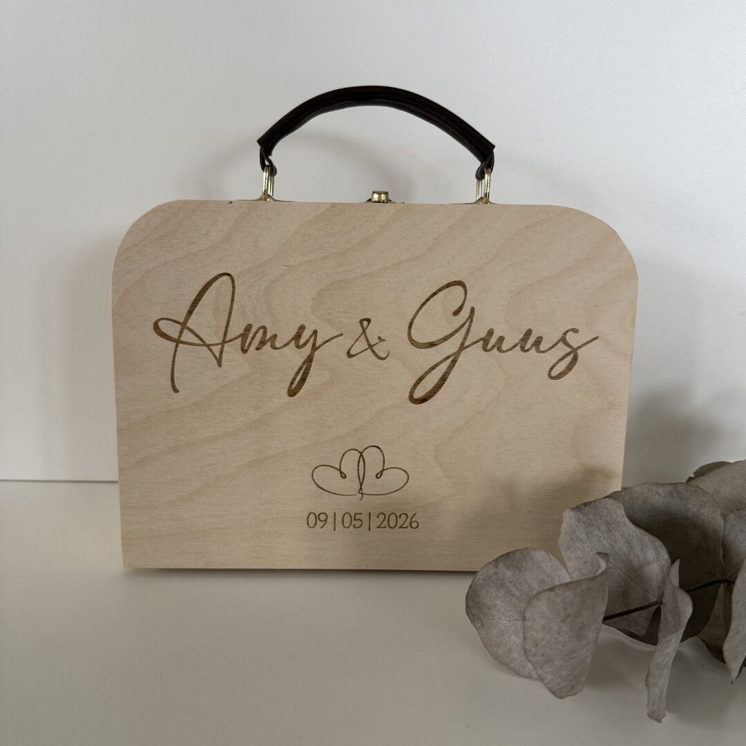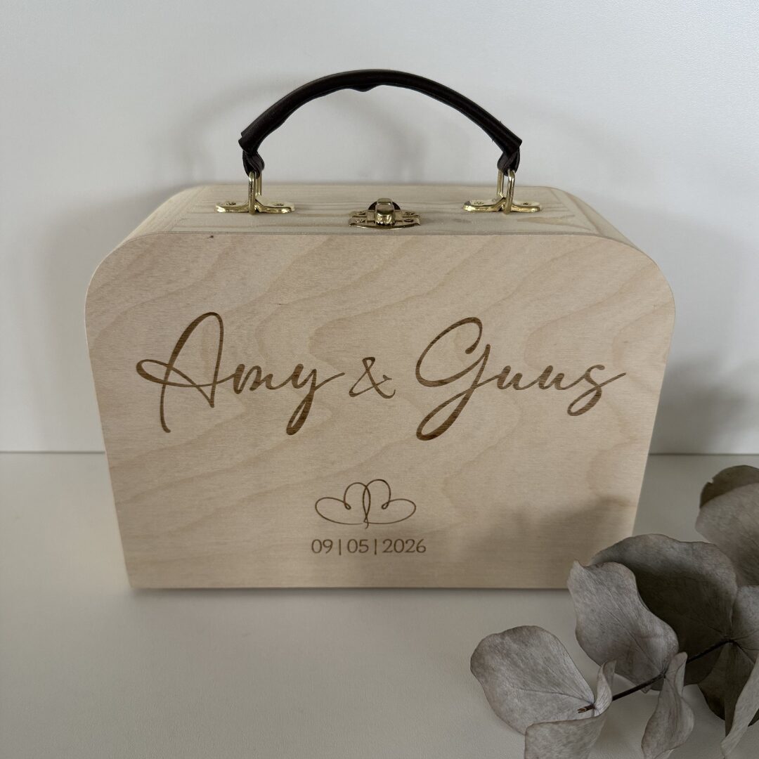 Tags: Houten koffertje – Gepersonaliseerd cadeau – Trouwen – Bruiloft – Jubileum – Namen en datum – Herinneringskist – Duurzaam hout – Cadeau bruidspaar