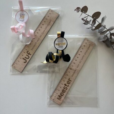 Op zoek naar een uniek en betekenisvol cadeau voor de meester of juf? Onze gepersonaliseerde houten liniaal juf en meester is de perfecte keuze. Laat een naam, boodschap of jaar graveren voor een persoonlijke touch die dagelijks herinneringen oproept aan een bijzondere band.