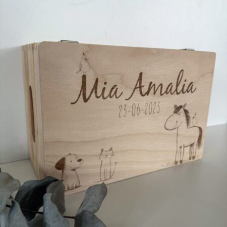Bestel vandaag nog jouw houten memorybox met dieren en creëer een blijvende herinnering vol liefde. Een uniek, persoonlijk cadeau dat generaties lang gekoesterd kan worden. Heb je andere wensen? Neem contact met ons op via het contactformulier of mail ons en vertel ons hoe we de memorybox kunnen personaliseren. We zorgen ervoor dat hun bewaarkist een uniek en speciaal geschenk wordt.