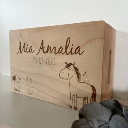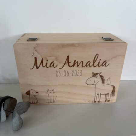 De subtiele gravure van deze dieren symboliseert vriendschap, trouw en geborgenheid – eigenschappen die perfect passen bij de bijzondere momenten die je in deze box bewaart. Of het nu gaat om geboortekaartjes, eerste schoentjes, foto’s of lieve brieven: deze houten bewaardoos vertelt het verhaal van een leven vol mooie herinneringen.