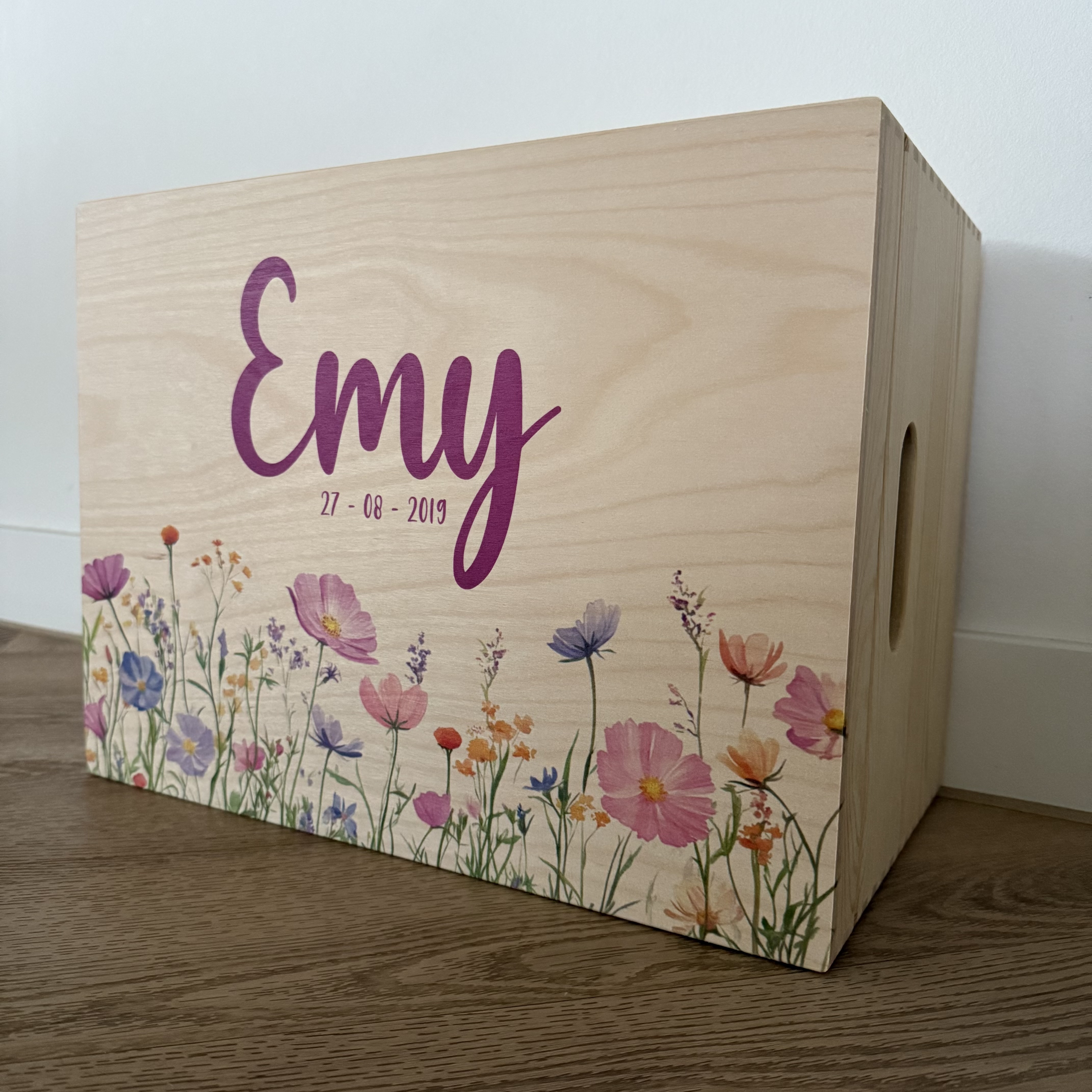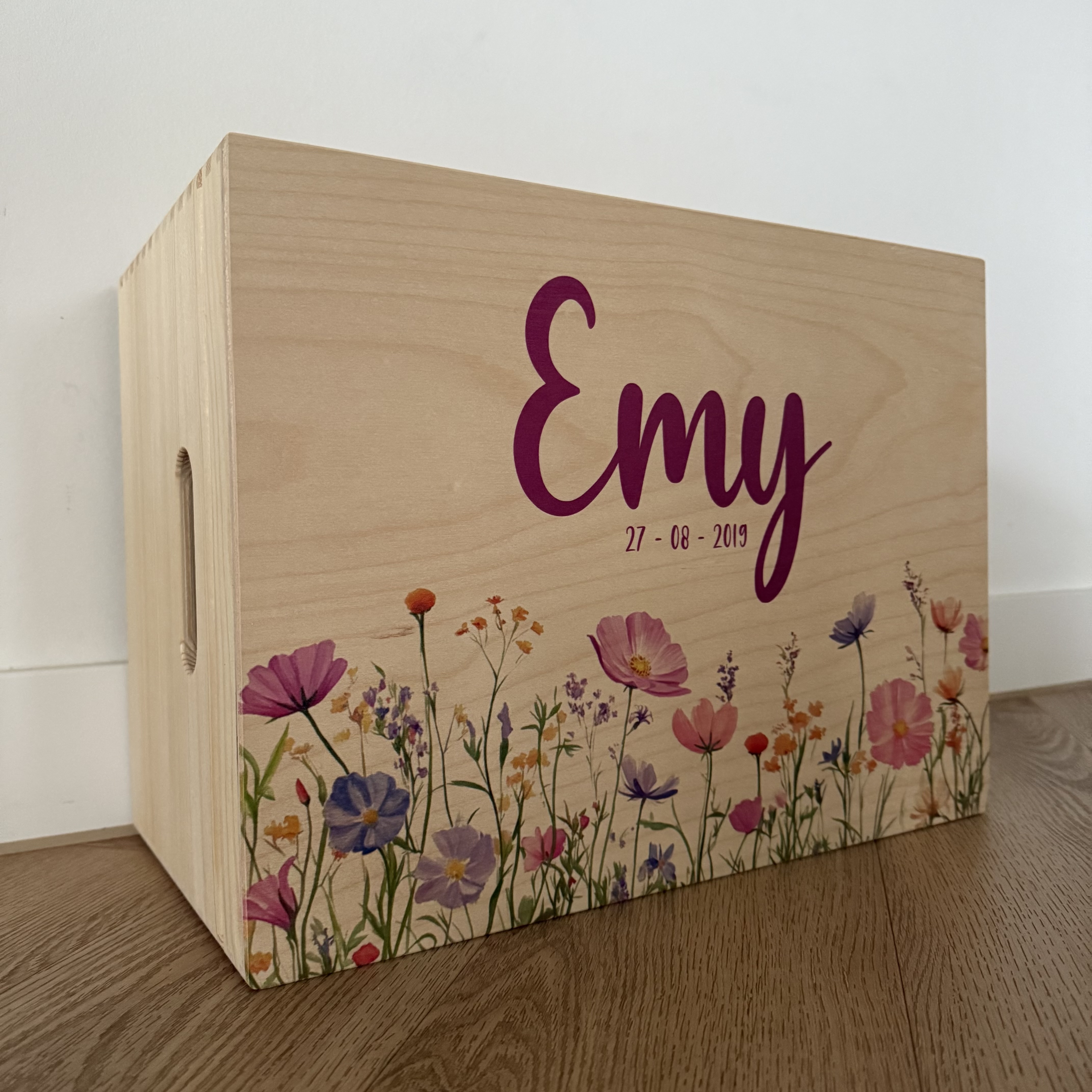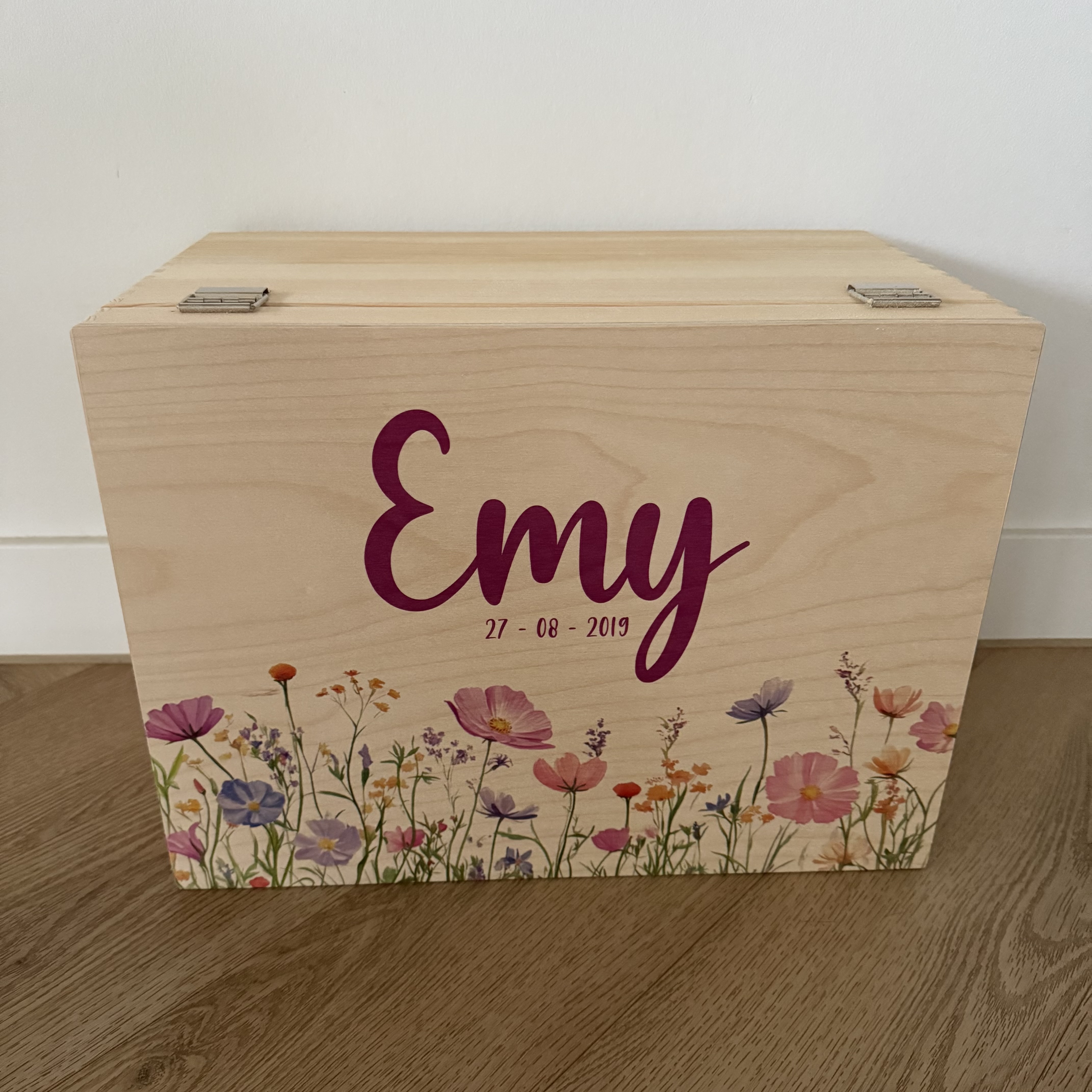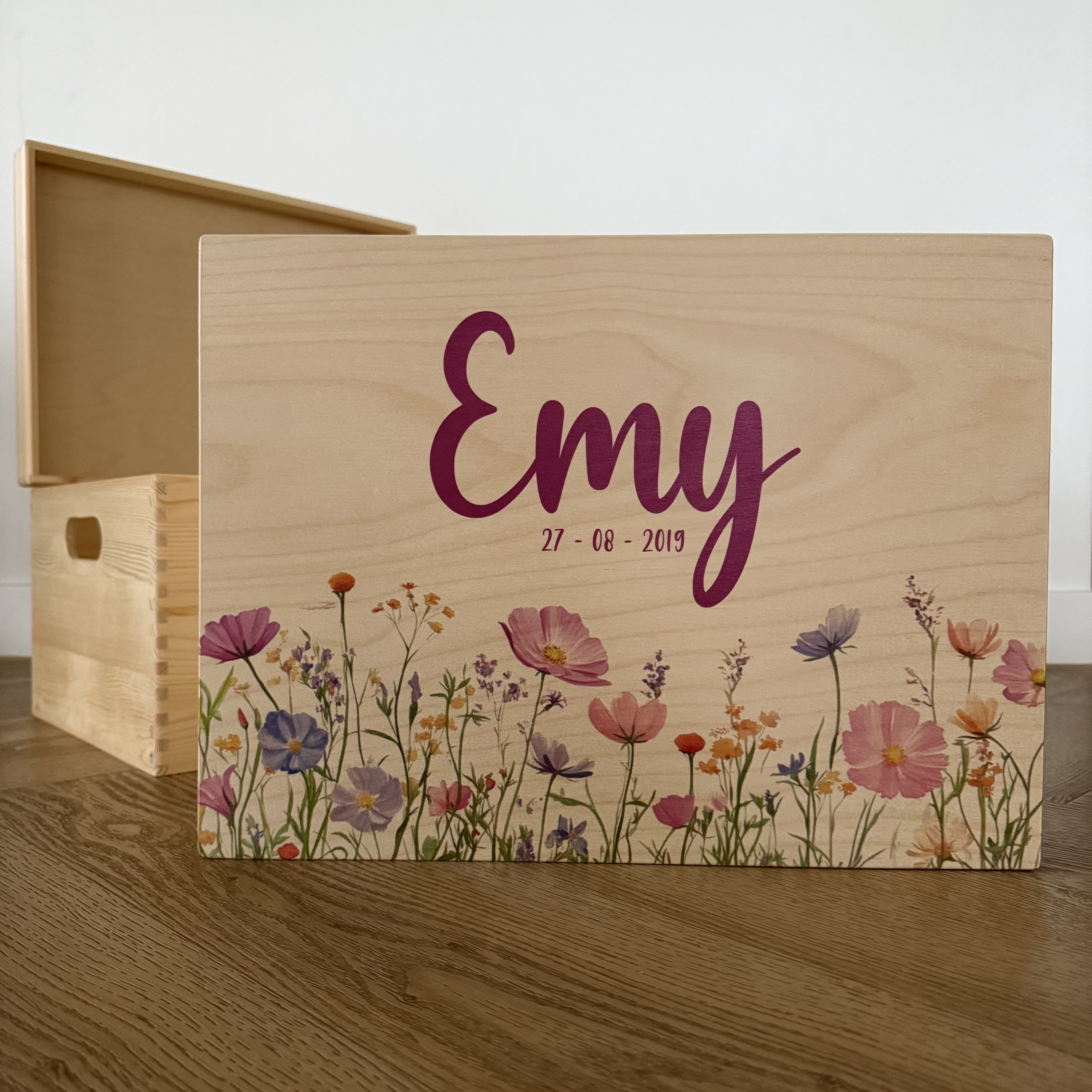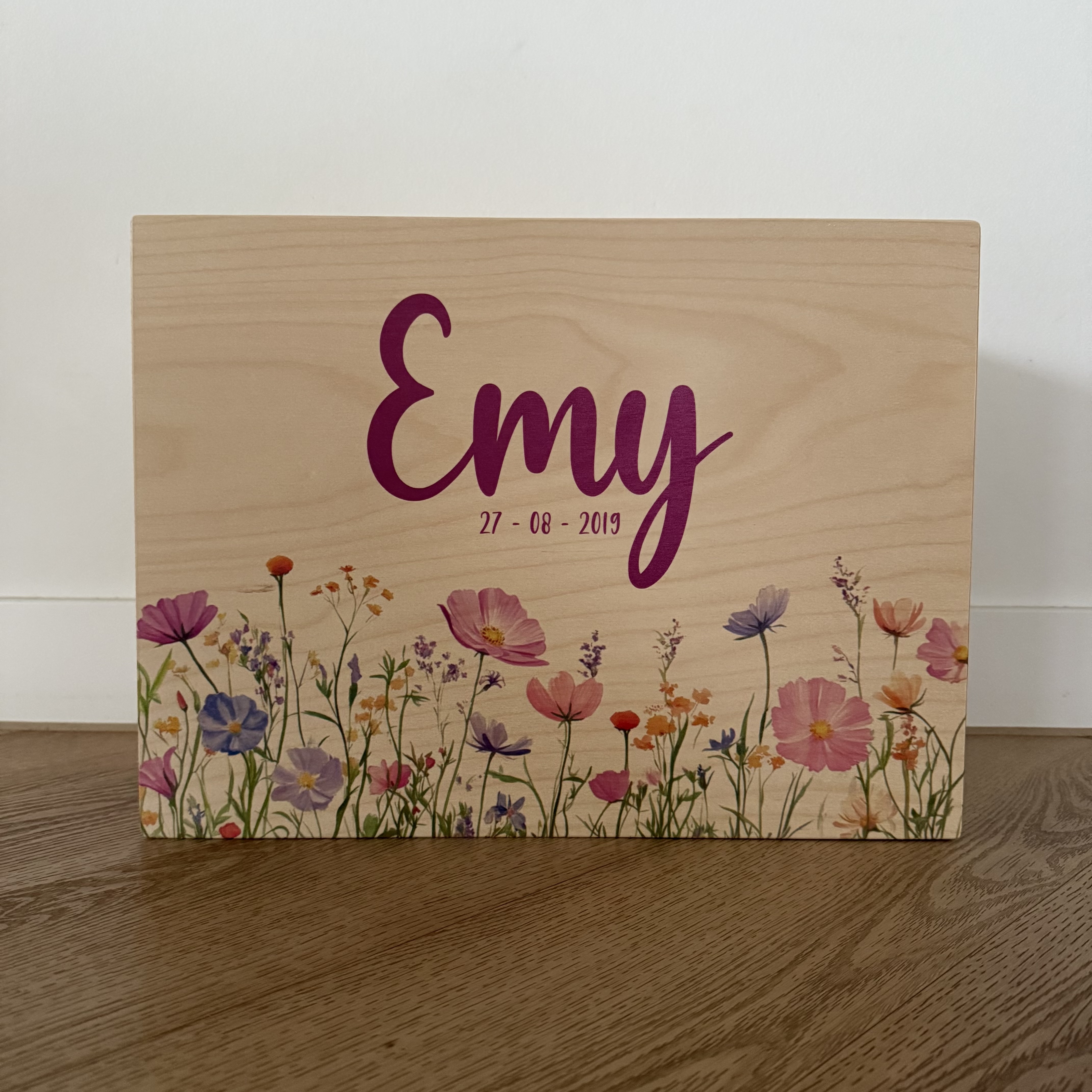Deze gepersonaliseerde houten memorybox met het thema wilde bloemen is een liefdevolle en stijlvolle manier om de mooiste herinneringen aan je baby te bewaren. De precieze gekleurde print met bloemen geeft de box een natuurlijke, zachte uitstraling en maakt hem persoonlijk en tijdloos.