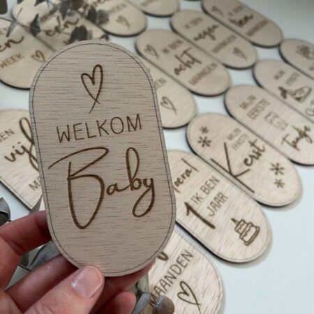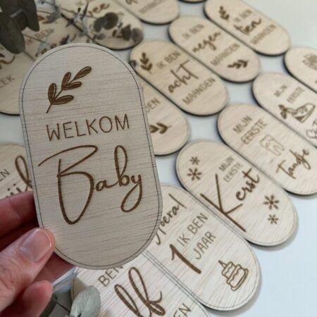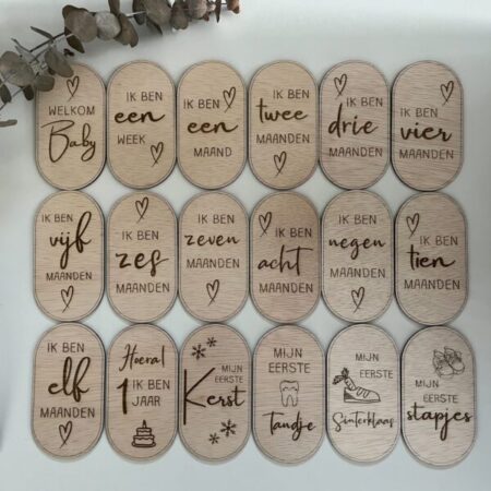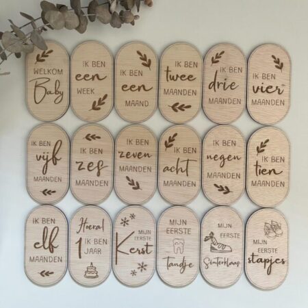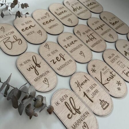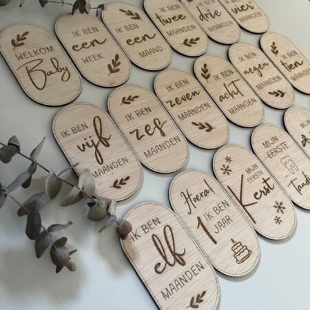 Welkom in de wereld van wonderen en mijlpalen! Onze unieke mijlpalenkaartjes 1e jaar van hout zijn perfect voor het vastleggen van de kostbare momenten van je kleintje gedurende het eerste jaar van zijn of haar leven. Elk kaartje is met liefde ontworpen om de magie van deze bijzondere tijd te vangen. Personaliseer ze met de naam van je baby voor een persoonlijk tintje. Maak van elke mijlpaal een blijvende herinnering met deze charmante houten kaartjes, bestaande uit 18 mijlpalenkaartjes. Bestel vandaag nog en koester de groei van je kleintje!