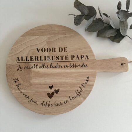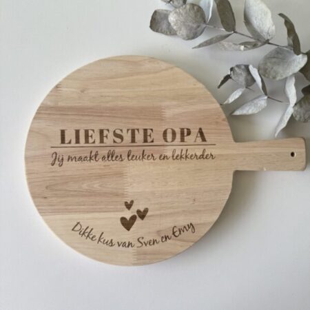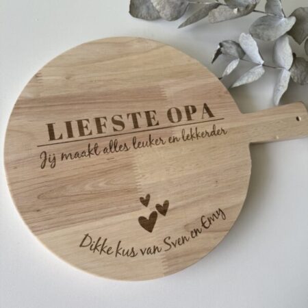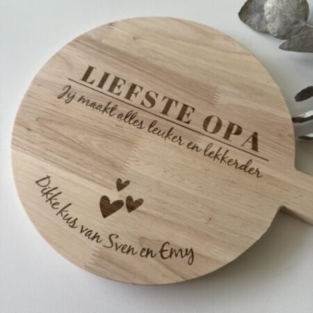 Tags: Houten borrelplank – Borrelplank met tekst – Hapjesplank gepersonaliseerd – Gegraveerde plank – Persoonlijk cadeau – Cadeau met naam – Rubberhout plank – Uniek cadeau – Borrelplank rond