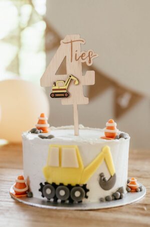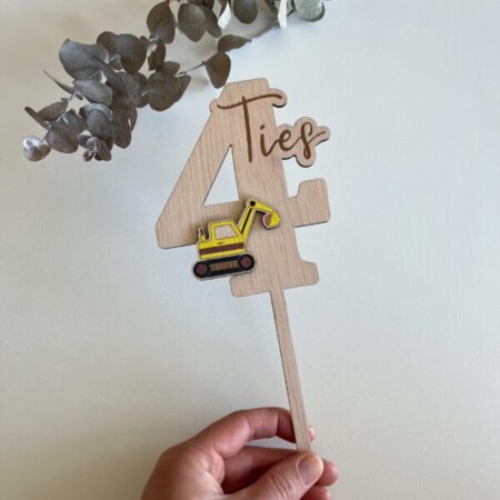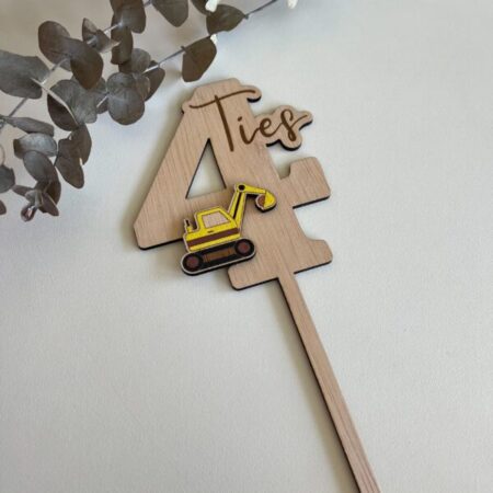 Stel je voor: een verjaardagstaart die niet alleen heerlijk smaakt, maar ook een persoonlijke en unieke uitstraling heeft. Bekijk daarvoor deze houten taarttopper naam met graafmachine. Met de mogelijkheid om de leeftijd te kiezen en de gekleurde figuurtjes toe te passen, creëer je een taartdecoratie die perfect past bij de stijl en persoonlijkheid van de jarige.