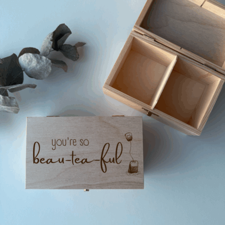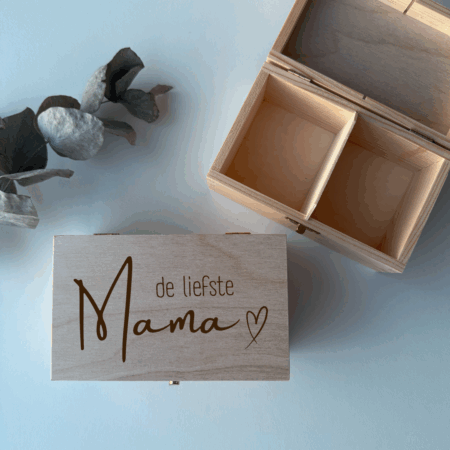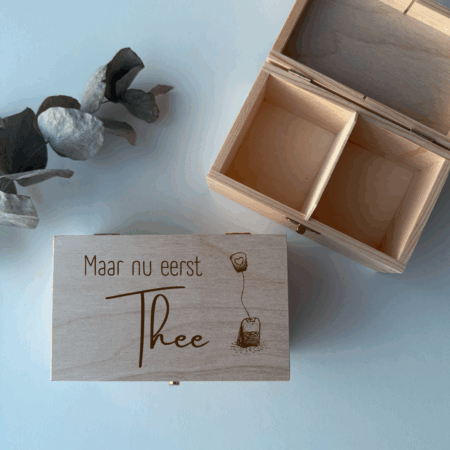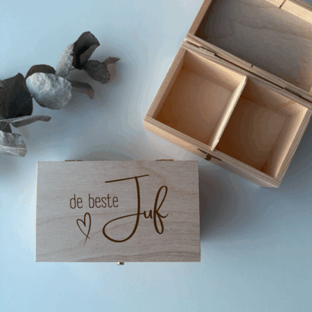 Een doos chocolade of een bloemetje is altijd leuk, maar met dit houten theedoosje met persoonlijke tekst geef je iets blijvends én unieks. Of je nu een lief bedankje wilt geven of iemand in het zonnetje wilt zetten – dit cadeau blijft nog lang op tafel staan. Perfect als moederdagcadeau, juffencadeau of als persoonlijk geschenk voor een theeliefhebber die wel wat extra aandacht verdient.