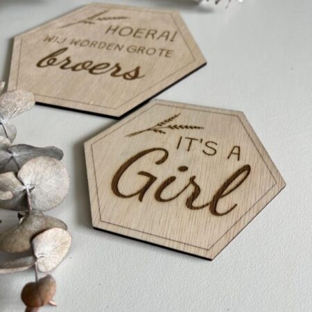Geef jullie grote nieuws een persoonlijke en betekenisvolle touch met onze prachtige zwangerschapsaankondiging – It’s a girl! Dit houten bordje is het begin van een onvergetelijk hoofdstuk in jullie leven.